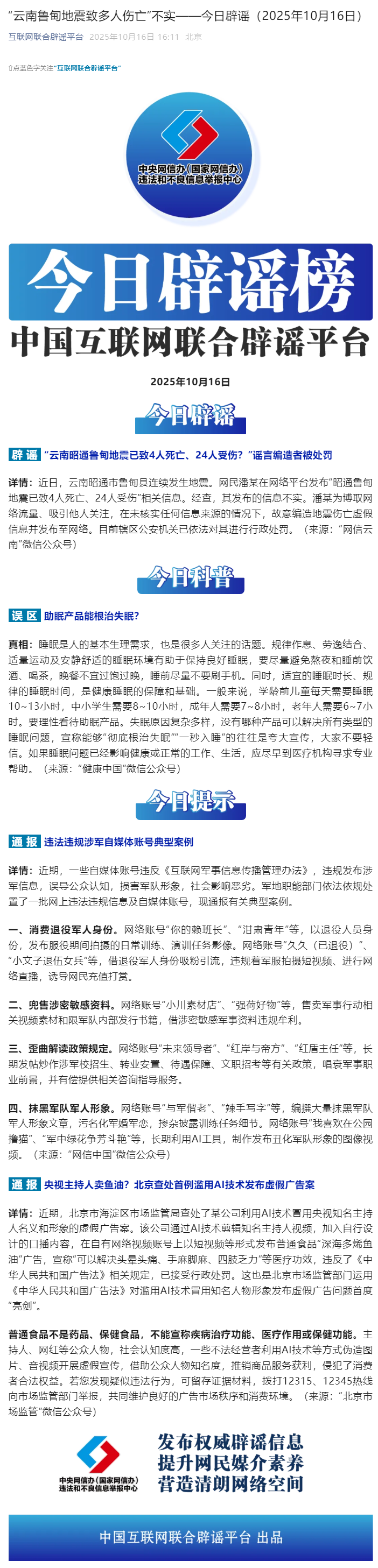 “云南鲁甸地震致多人伤亡”不实——今日辟谣(2025年10月16日)