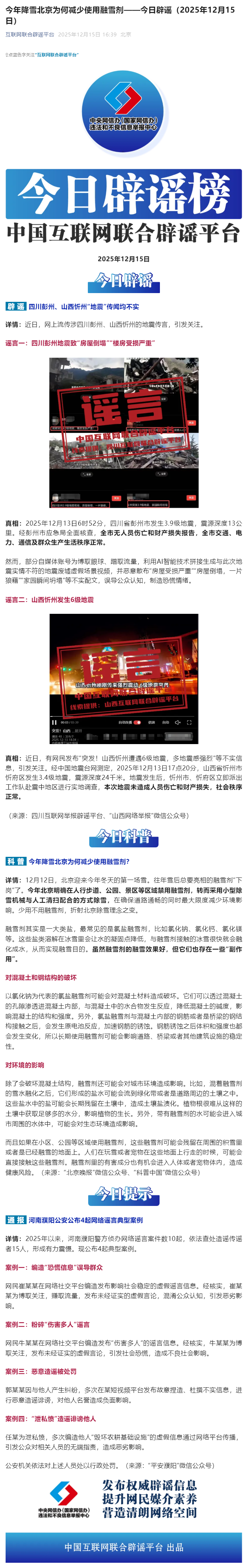 今年降雪北京为何减少使用融雪剂——今日辟谣(2025年12月15日)