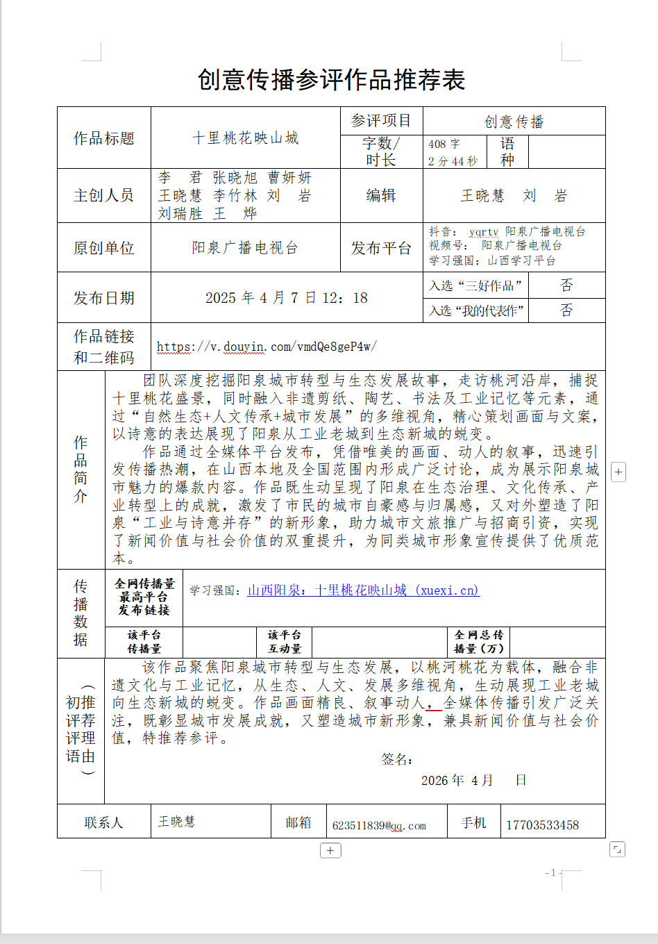 阳泉广播电视台山西新闻奖创意传播推荐作品(公示版)